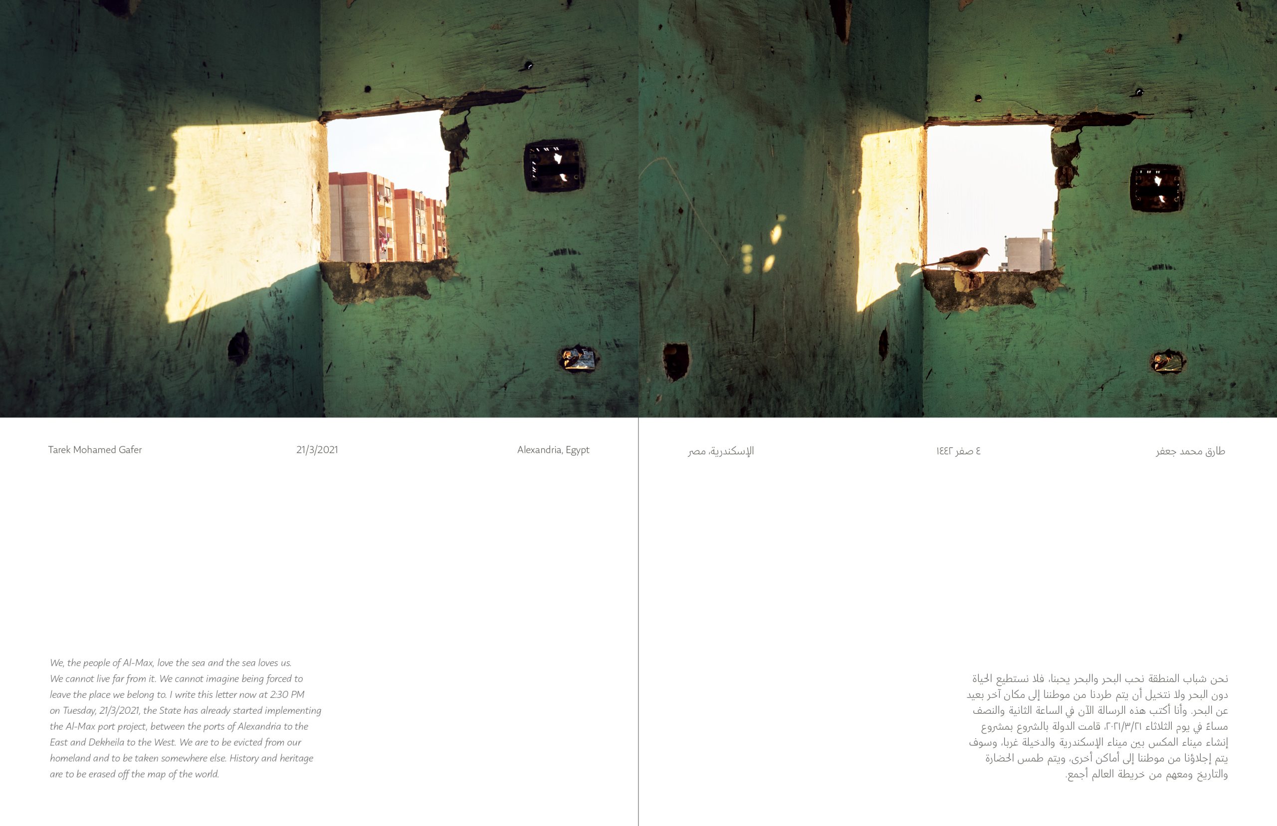 Aquesta publicació és fruit del III Premi Mediterrani Albert Camus Incipiens, organitzat per les Trobades & Premis Mediterranis Albert Camus de Menorca. Iniciat el 2016, el projecte segueix, a través de la fotografia, els arxius comunitaris, les cartes manuscrites i els testimonis, els residents d’Al-Max, un barri de pescadors històric d’Alexandria, Egipte, que ara s’enfronta al desplaçament. A mesura que el desenvolupament urbà esborra la seva vida quotidiana i les seves tradicions, Mohamed Mahdy construeix el treball amb els propis residents: les famílies comparteixen arxius, escriuen cartes finals abans de sortir de casa i donen forma a la seva representació. El projecte reflexiona sobre com la memòria, la identitat i la pertinença perduren quan un lloc es perd físicament.